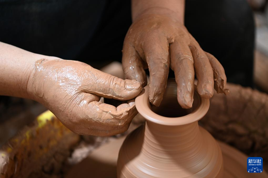 一把黃泥,一雙巧手,在勻速轉動的旋轉盤帶動下,不一會功夫,一件彩陶的泥胎就成形了??此坪唵蔚牟僮?,閻建林已孜孜不輟做了36載。