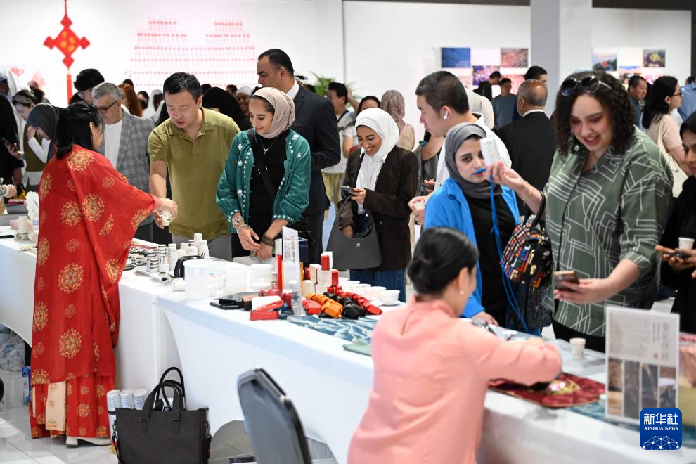 9月3日,人們在科威特艾哈邁迪省舉行的“天涯共此時·湘約中東”文藝演出活動前參觀中國茶藝文化展臺。