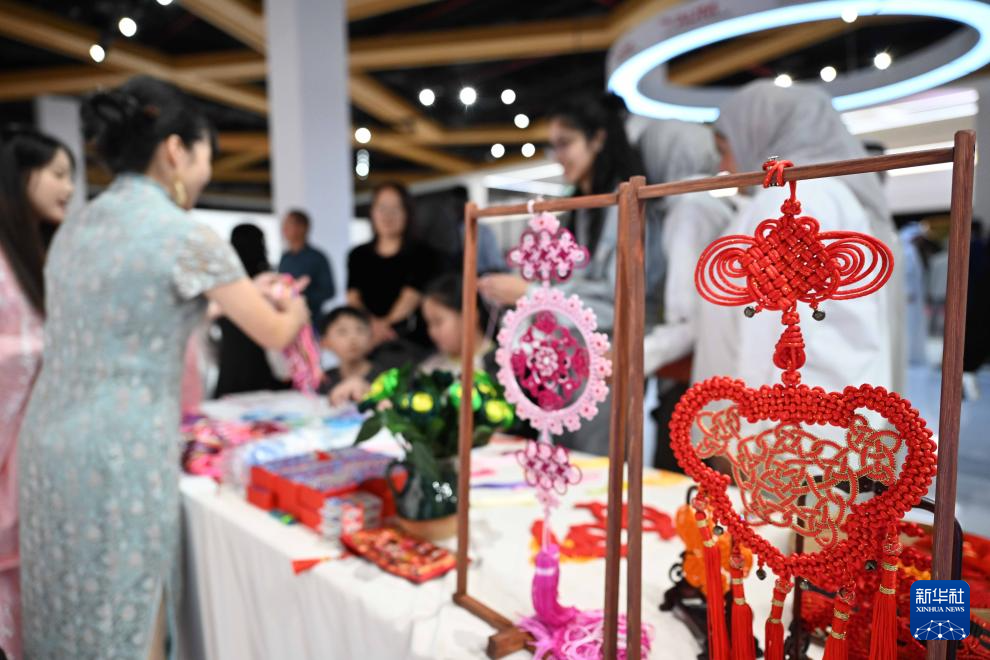 9月3日,人們在科威特艾哈邁迪省舉行的“天涯共此時·湘約中東”文藝演出活動前參觀中國傳統文化展臺。