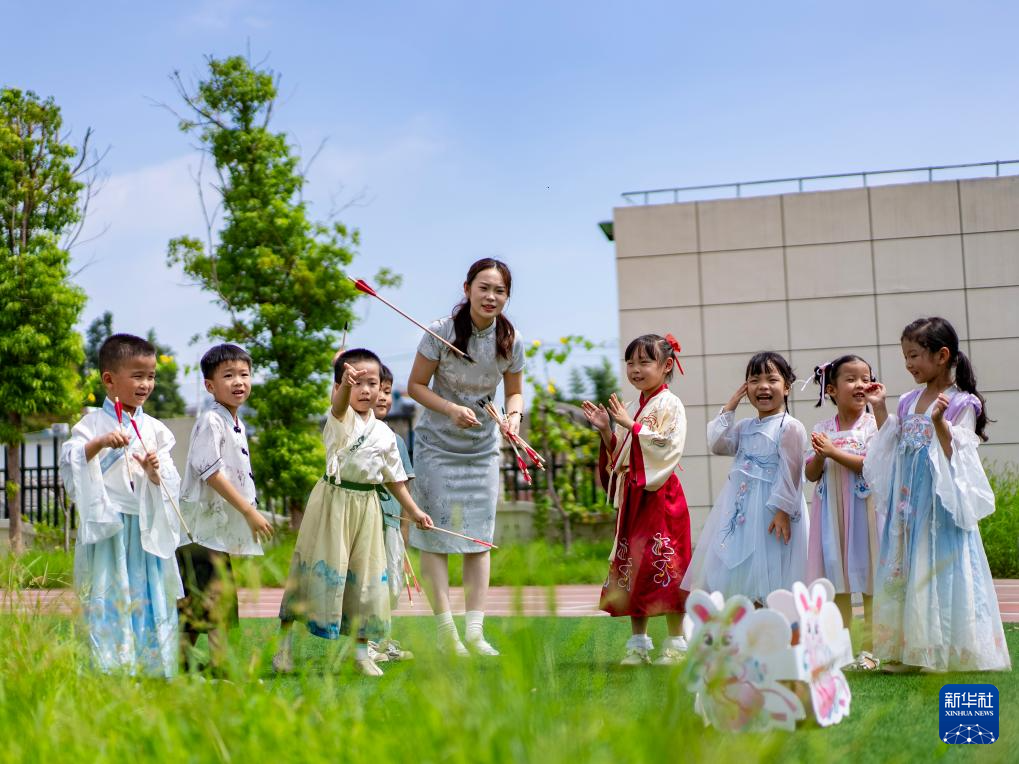 9月8日,在江蘇省興化市文林幼兒園,小朋友們進行投壺比賽。