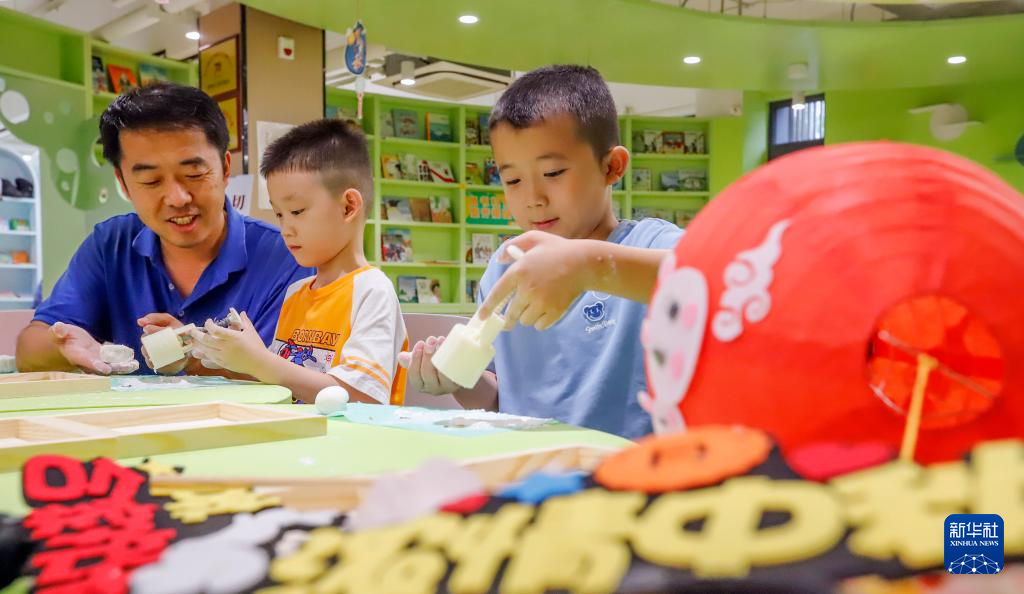 9月8日,在河北省遵化市新華書店舉行的兒童迎中秋主題活動中,工作人員和小朋友一起做手工月餅。