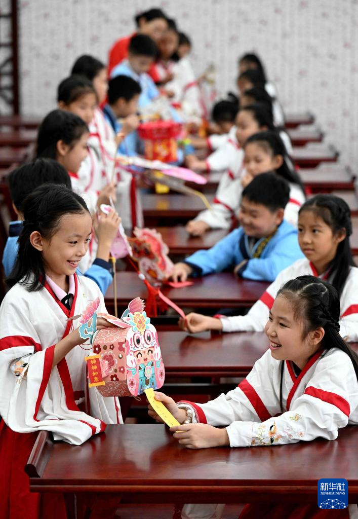 9月8日,在河北省石家莊市北郡小學迎中秋系列民俗主題活動中,學生們在猜燈謎。