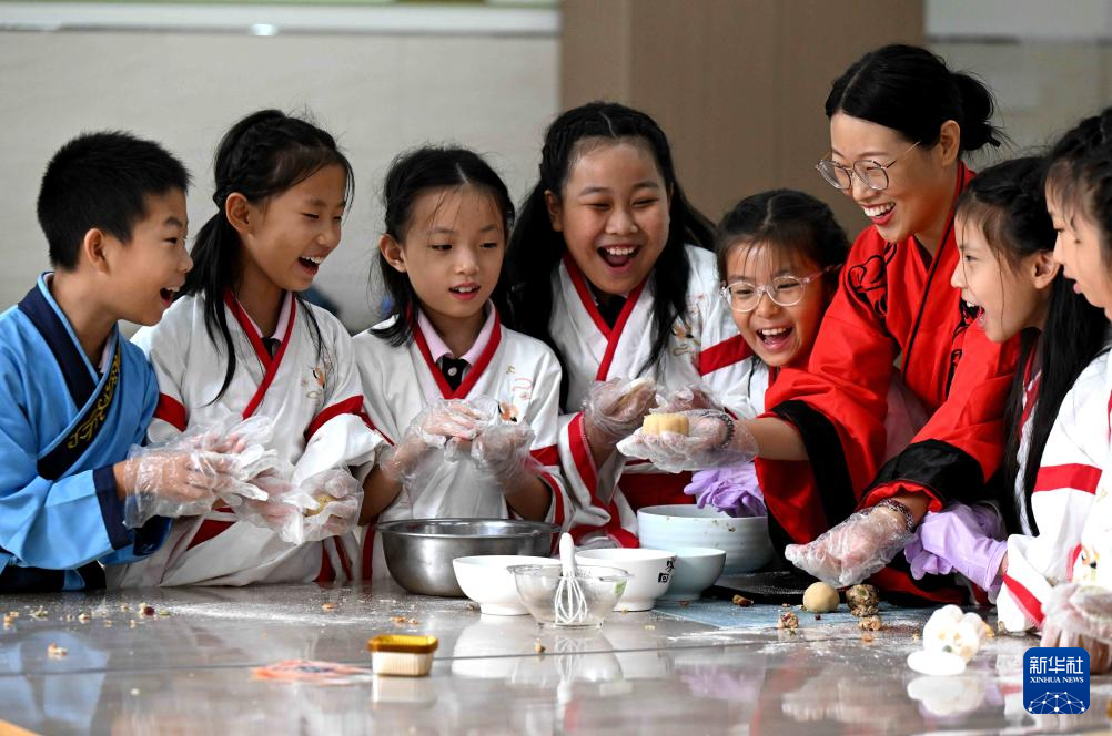 9月8日,在河北省石家莊市北郡小學,小朋友在老師的指導下制作月餅。