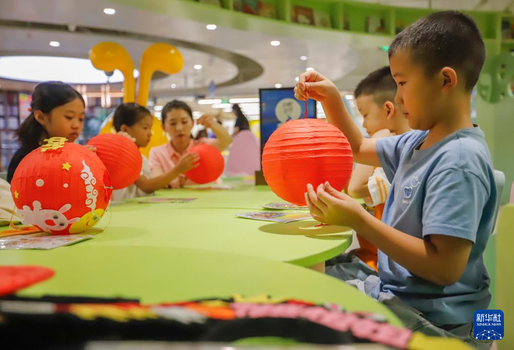 9月8日,在河北省遵化市新華書店舉行的兒童迎中秋主題活動中,工作人員和小朋友一起做燈籠。