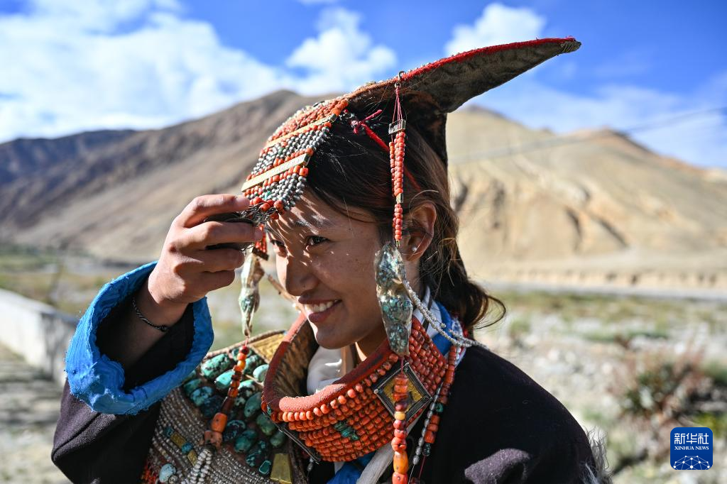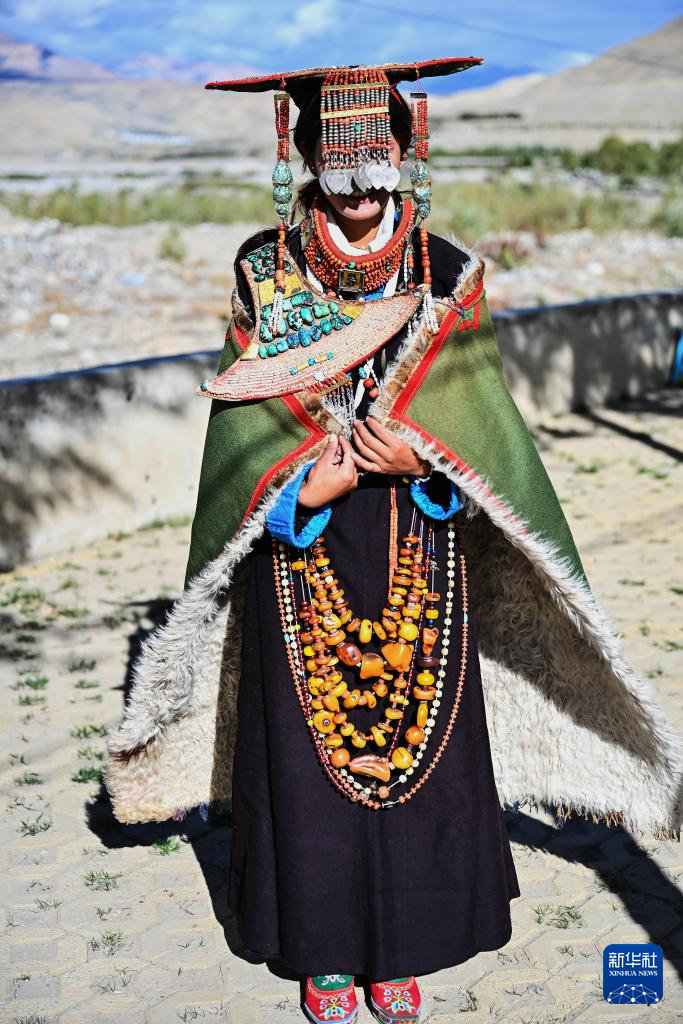 9月9日,在西藏阿里地區普蘭縣科迦村,村民展示普蘭服飾。