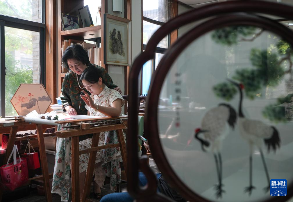 9月10日,中國工藝美術大師趙紅育(左)在輔導學生制作無錫精微繡雙面繡作品。蘇繡(無錫精微繡)于2008年被列入第二批國家級非物質文化遺產。