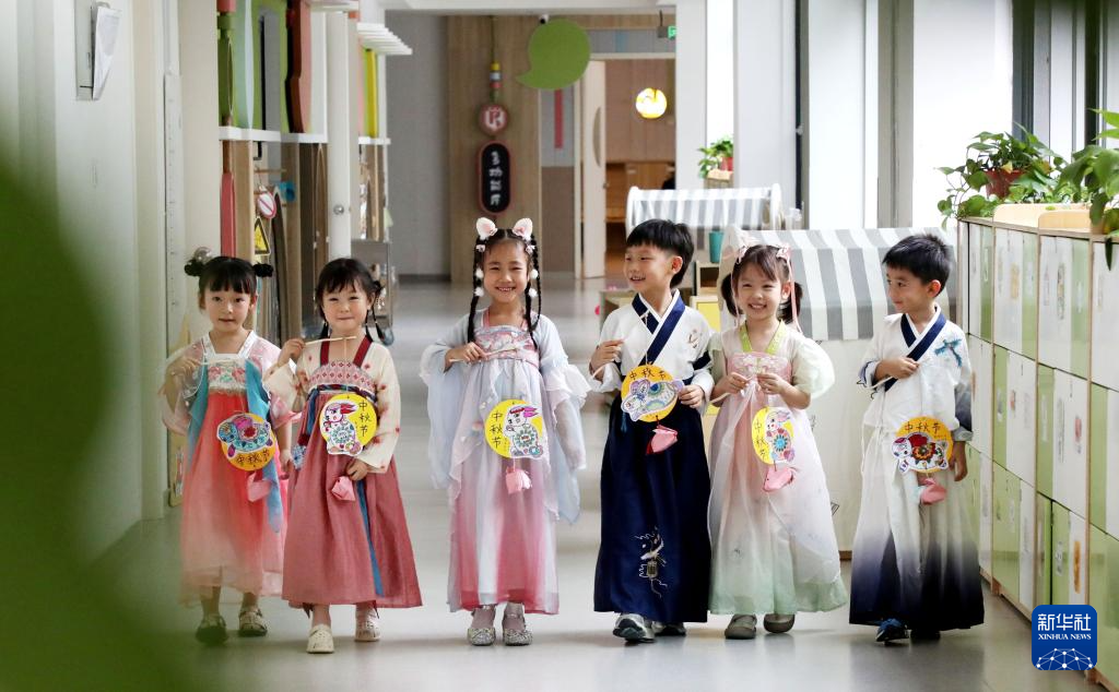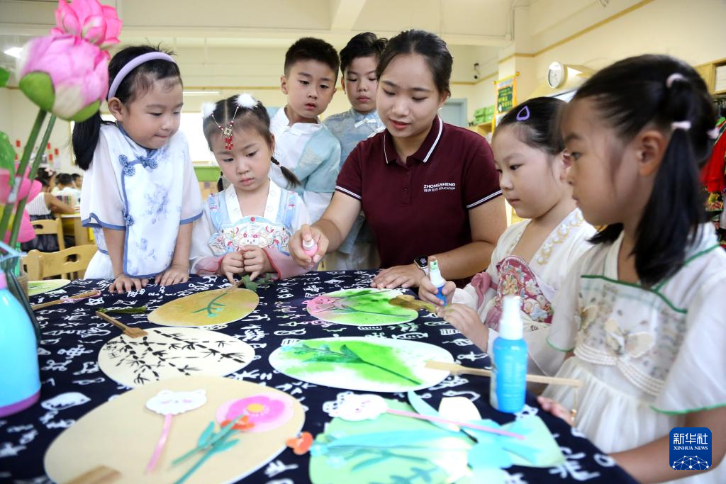 9月11日,在江蘇省連云港市鐘聲幸福幼兒園,老師指導小朋友制作中秋團扇。