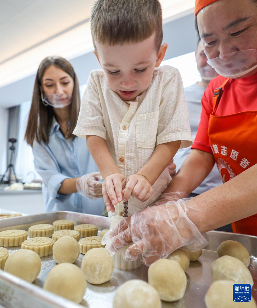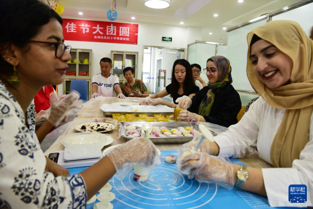 9月11日,在江蘇省鎮江市金湖社區,江蘇大學的外國留學生和居民一起制作月餅。