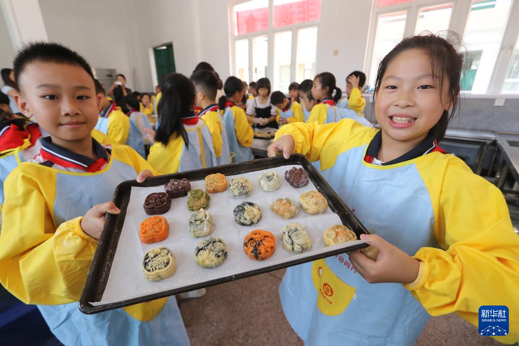9月12日,福建省南平市順昌縣實驗小學思賢校區的學生展示在家長指導下制做的月餅。