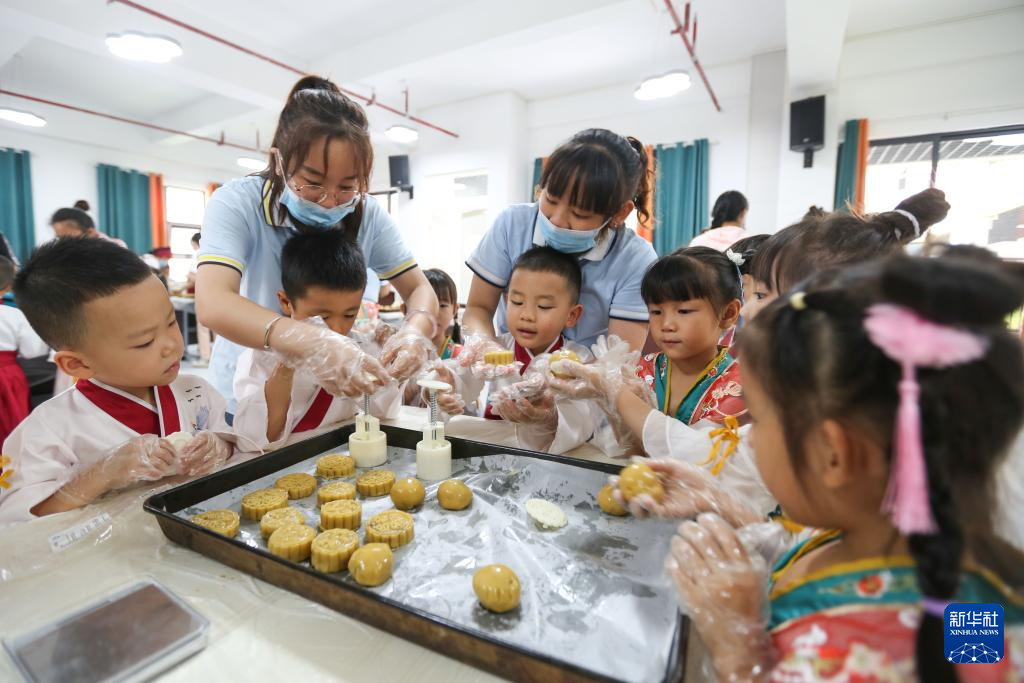 9月12日,貴州省黔南布依族苗族自治州都勻市青云湖幼兒園的老師和孩子們一起制作月餅。