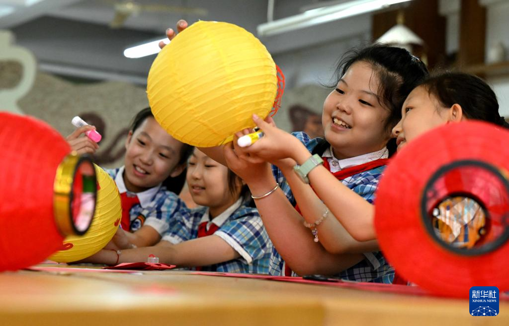 9月11日,在河北省石家莊市橋西外國語小學迎中秋活動中,孩子們在制作花燈。