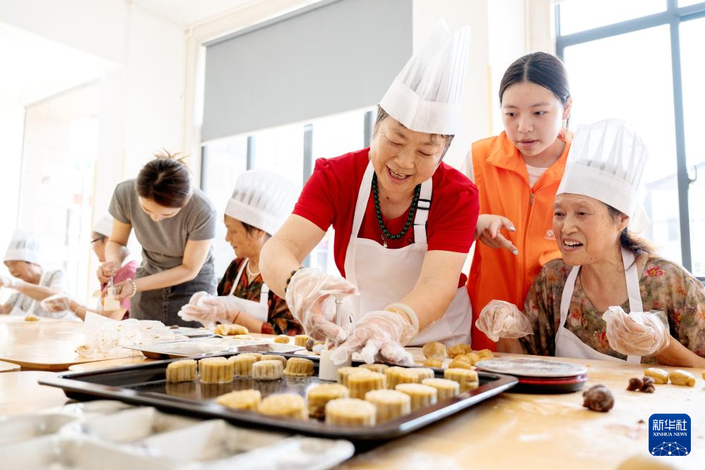 9月12日,浙江省湖州市長興縣林城鎮百葉龍社區老年學堂,老年人將壓制成型的手工月餅放入烤盤。