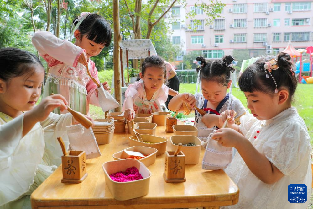 9月13日,福建武夷山市實驗幼兒園朱子校區的小朋友在制作香包。