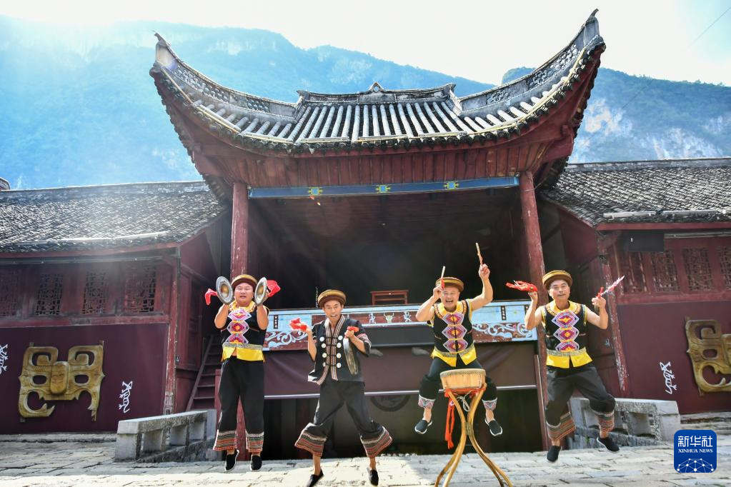 9月13日,在重慶市酉陽土家族苗族自治縣龔灘古鎮,非遺傳承人李明(右二)和班子在排練中秋演出的節目——非遺“酉陽耍鑼鼓”。
