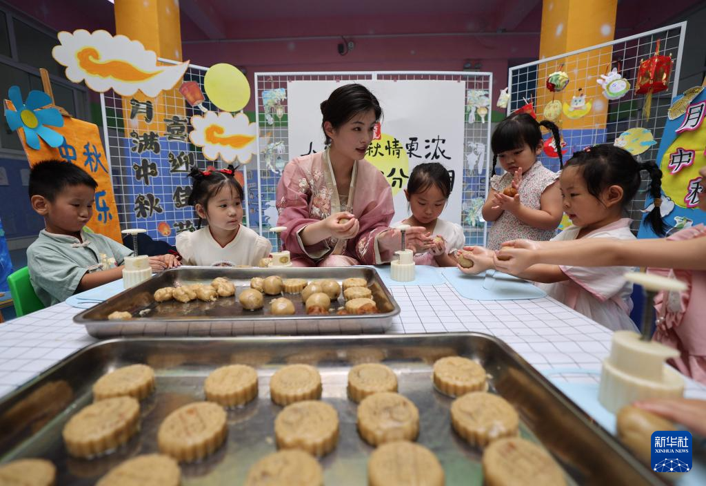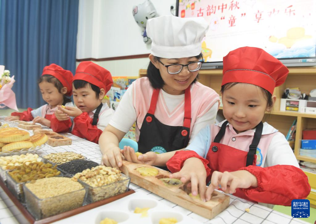 9月13日,河北省石家莊新樂市市直第三幼兒園的孩子在老師的指導下制作傳統月餅。