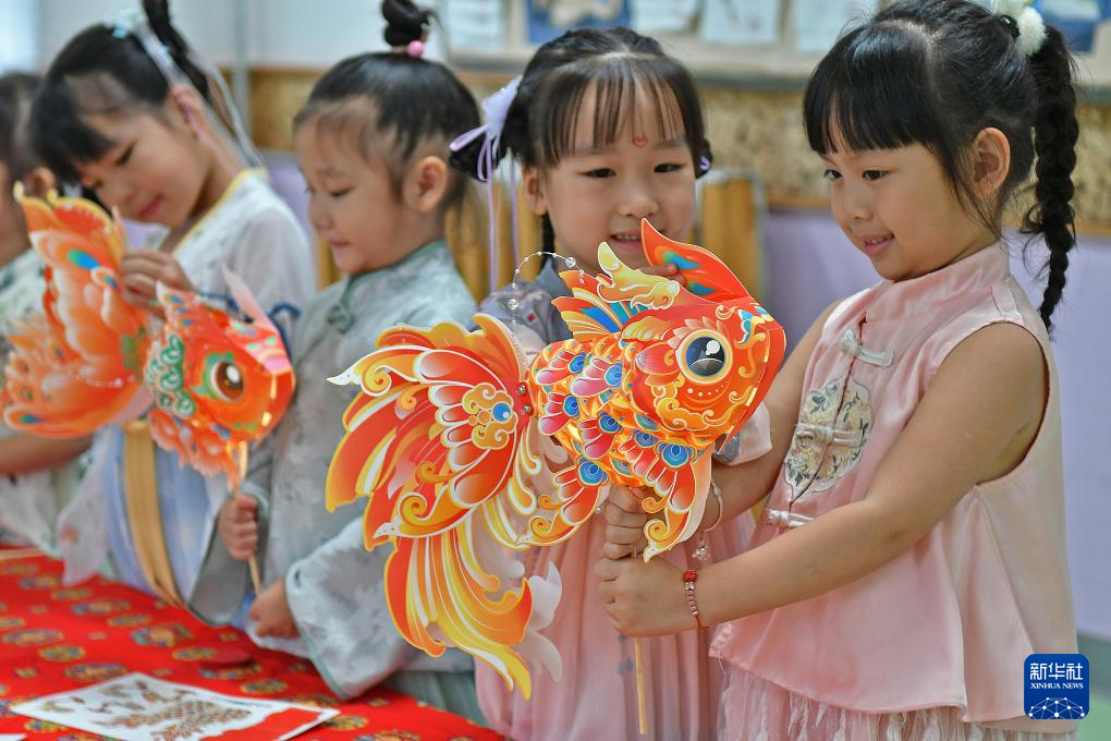 9月13日,山東省煙臺市福山區清洋街道中心幼兒園的小朋友在制作金魚花燈。