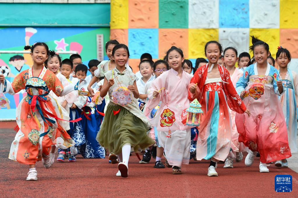 9月13日,在山東青島宜陽路小學開展的“多彩民俗迎中秋”主題活動上,孩子們手提花燈巡游。