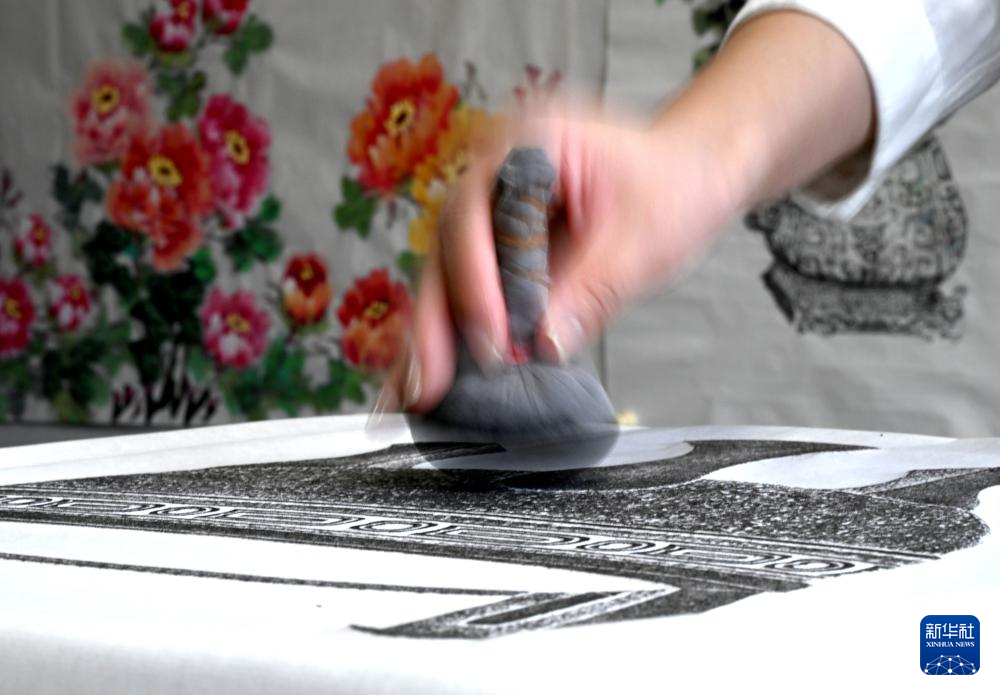 在洛陽華夏金石文化博物館,錢夏玉在拓印完成的金石拓片上補繪牡丹畫(9月11日攝)。