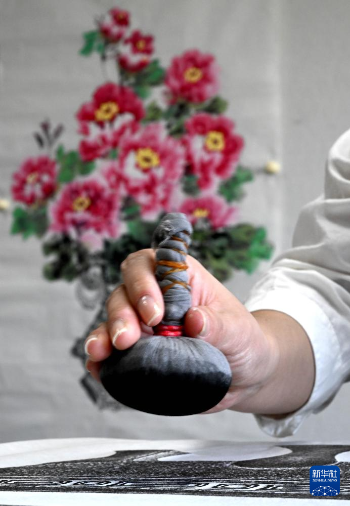 在洛陽龍門畫院,錢夏玉在拓印完成的金石拓片上補繪牡丹畫(9月11日攝)。