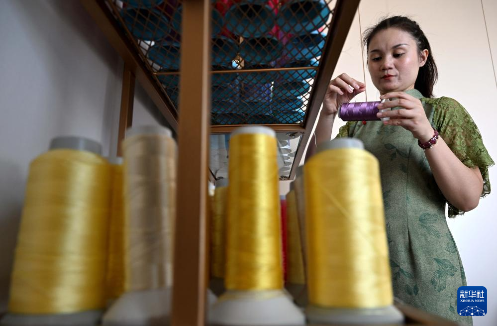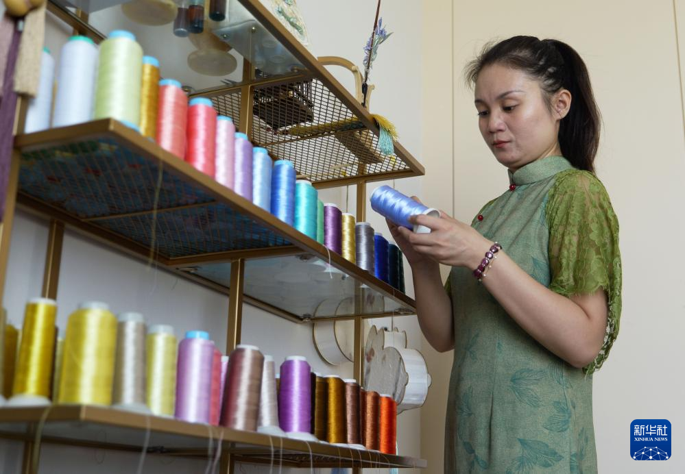 楚蒙丹在位于洛陽市的非遺體驗館里挑選絲線進行配色(9月12日攝)。