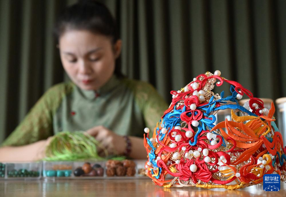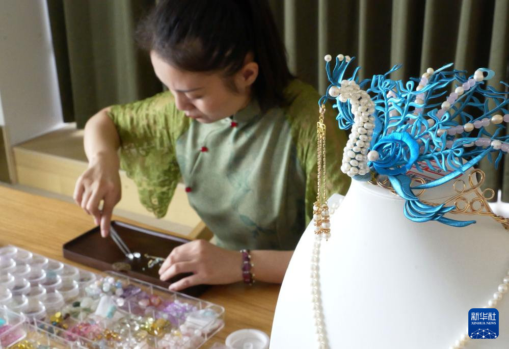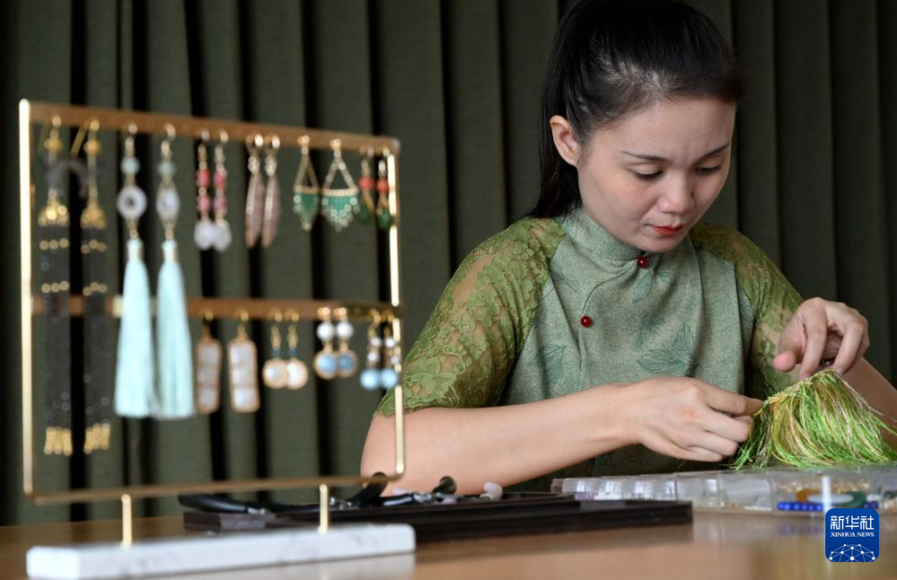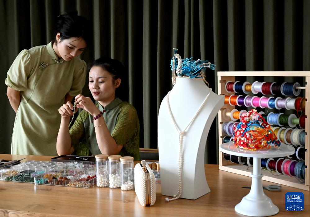 楚蒙丹在位于洛陽市的非遺體驗館里制作輯珠飾品(9月12日攝)。