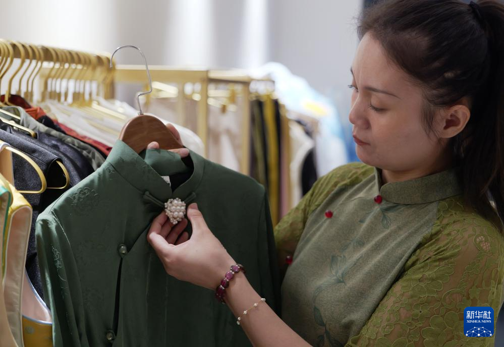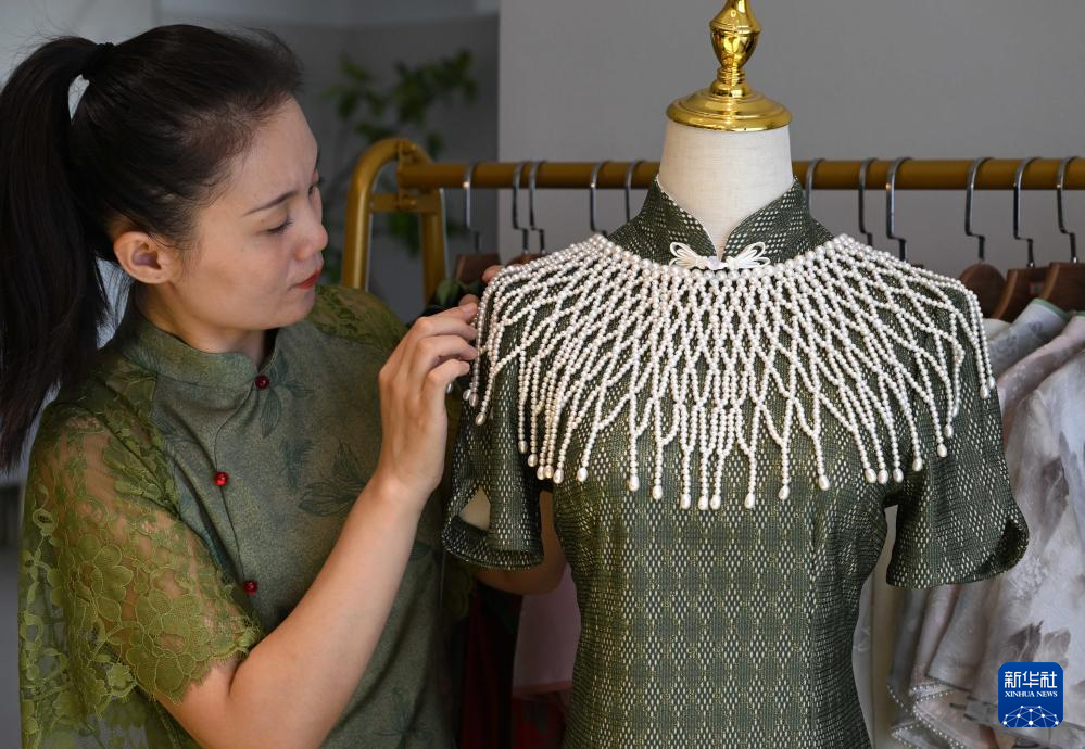 楚蒙丹在位于洛陽市的非遺體驗館里整理珍珠衫與服裝的貼合度(9月12日攝)。