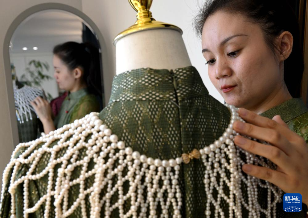 楚蒙丹在位于洛陽市的非遺體驗館里搭配珍珠輯珠胸針(9月12日攝)。