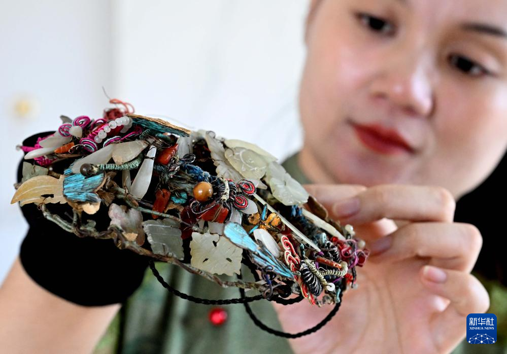 楚蒙丹在位于洛陽市的非遺體驗館里查看一件傳統飾品,學習輯珠技藝的手法和配色(9月12日攝)。