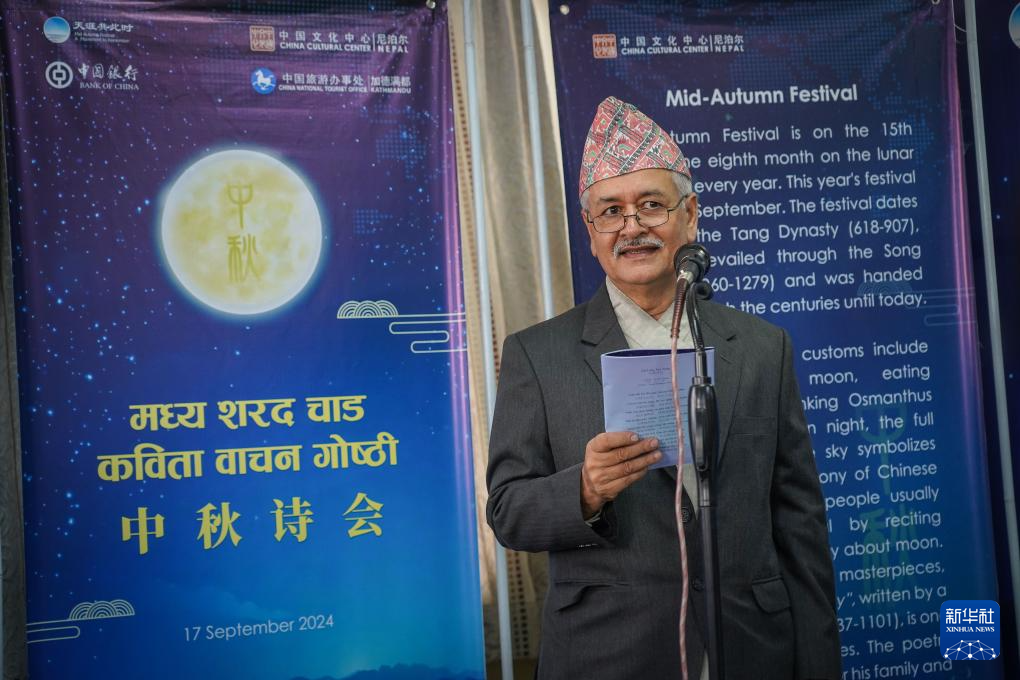 9月17日,在尼泊爾首都加德滿都,一名男子在“天涯共此時——中秋詩會”上朗誦詩歌。新華社發(哈里·馬哈爾詹攝)