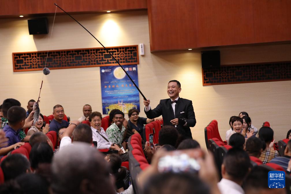 9月17日,在斐濟蘇瓦市政廳,演員在“知音湖北·遇見斐濟——天涯共此時中秋晚會”上表演魔術時與現場觀眾互動。新華社發(桑欽龍攝)