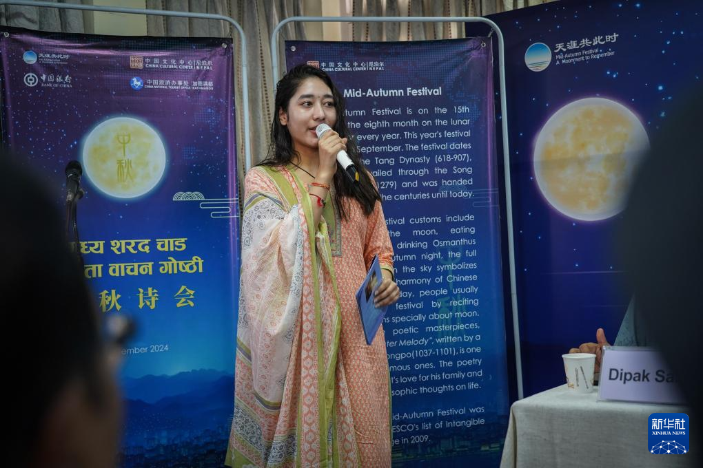 9月17日,在尼泊爾首都加德滿都,一名女子在“天涯共此時——中秋詩會”上朗誦詩歌。新華社發(哈里·馬哈爾詹攝)