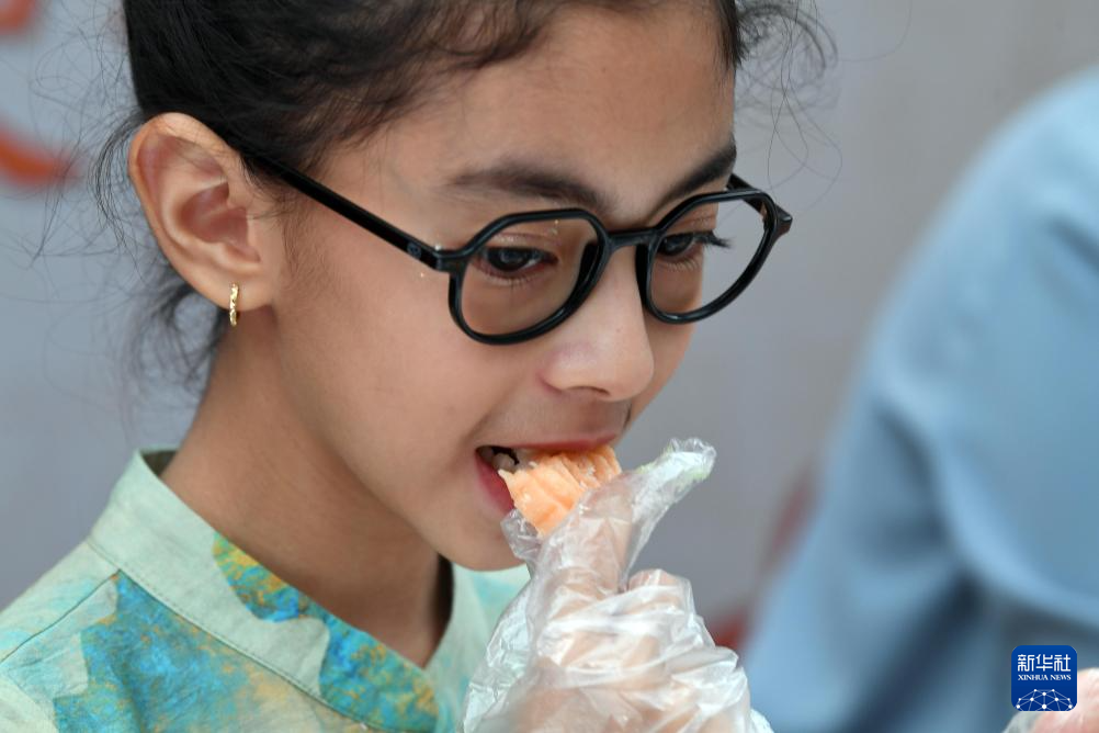 9月15日,在伊朗首都德黑蘭,一名兒童在中秋月餅制作體驗活動上品嘗月餅。新華社記者 沙達提 攝