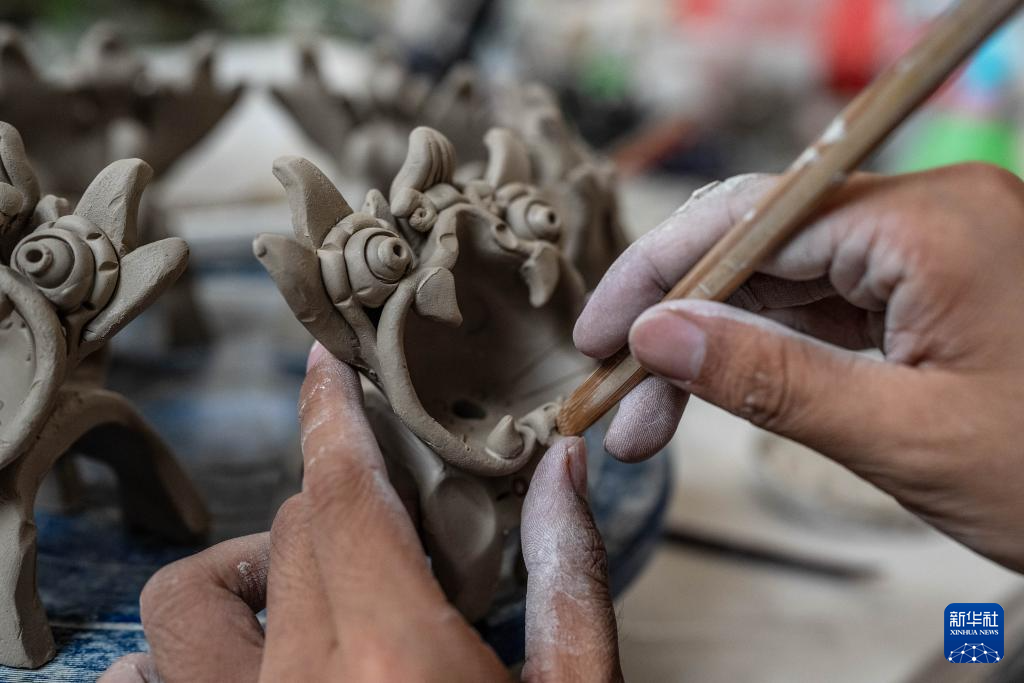 王子強在工作室給晾曬好的瓦貓上釉(9月18日攝)。