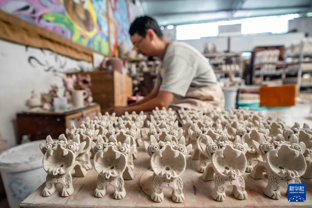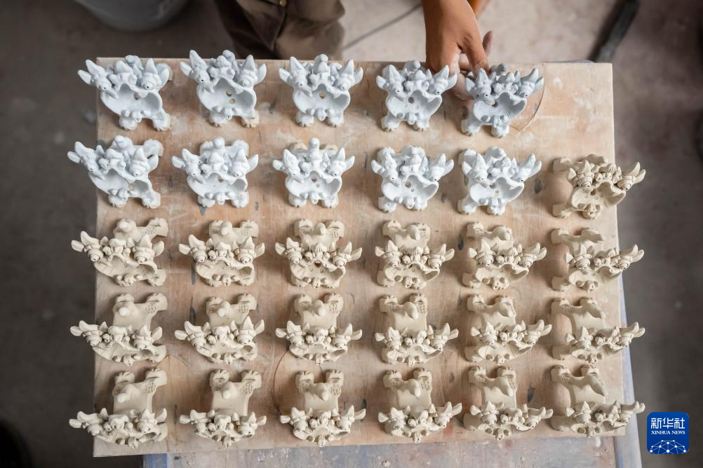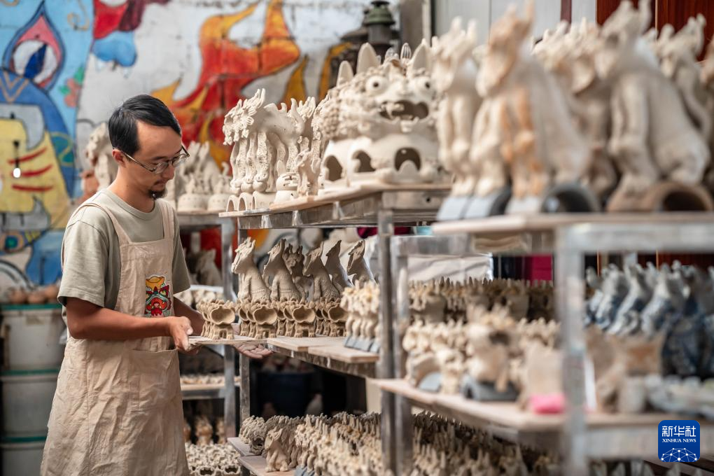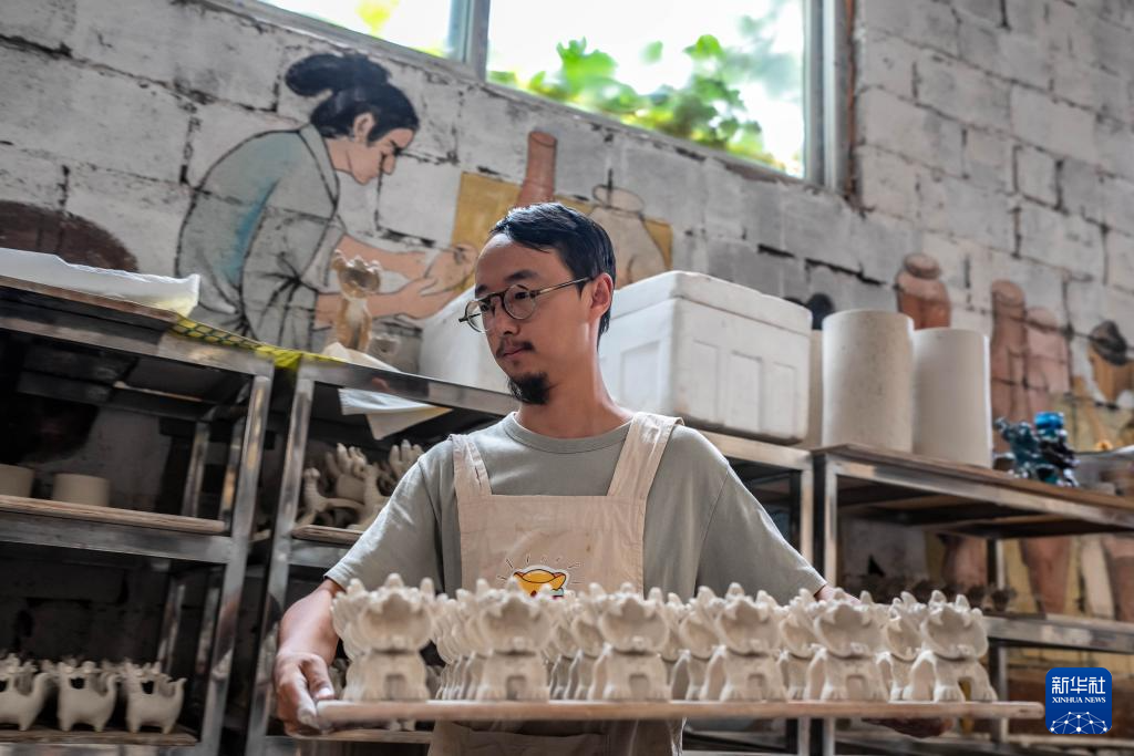 王子強在工作室晾曬塑形完成的瓦貓(9月18日攝)。