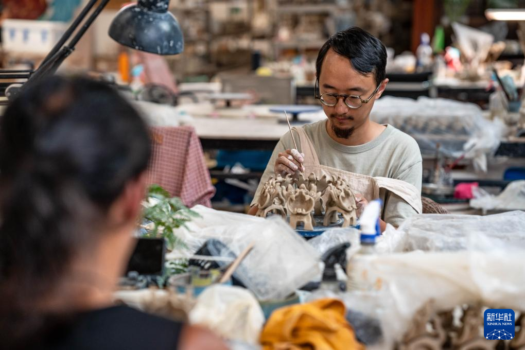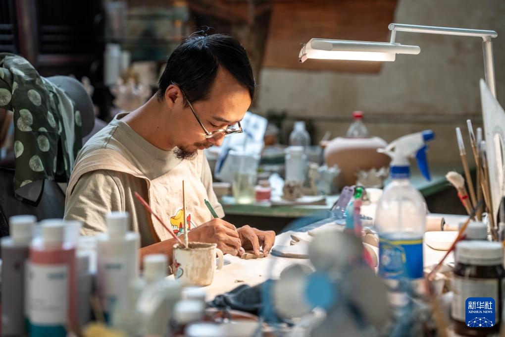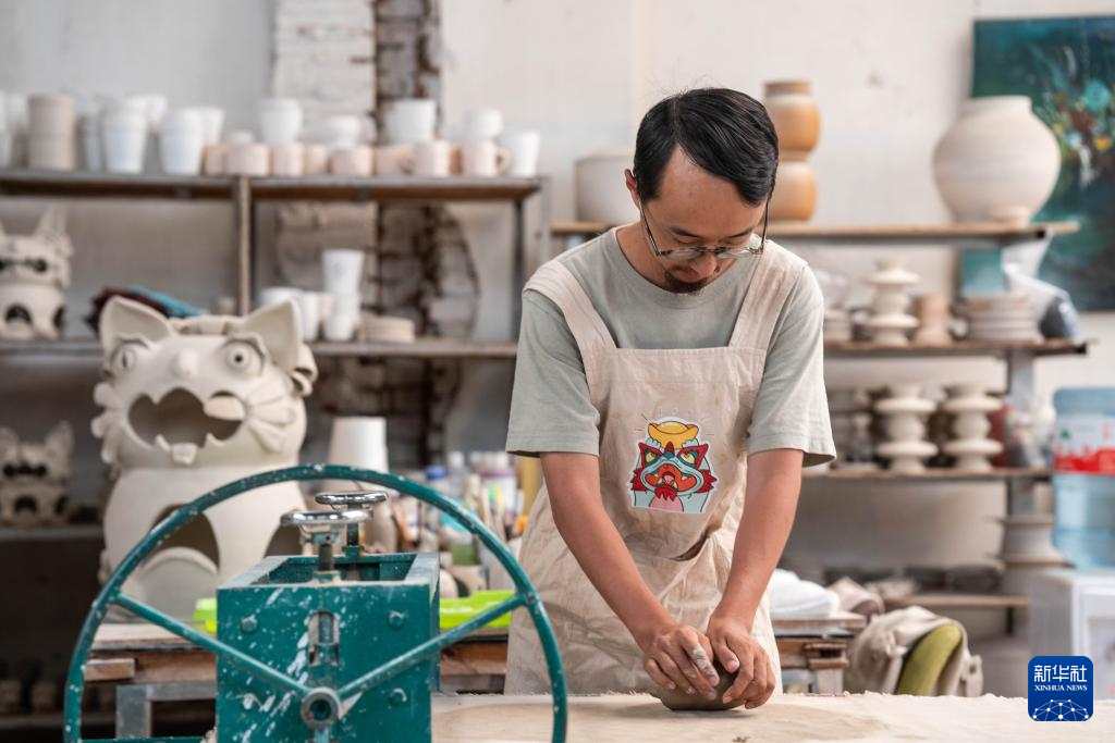 王子強在工作室內制作瓦貓(9月18日攝)。
