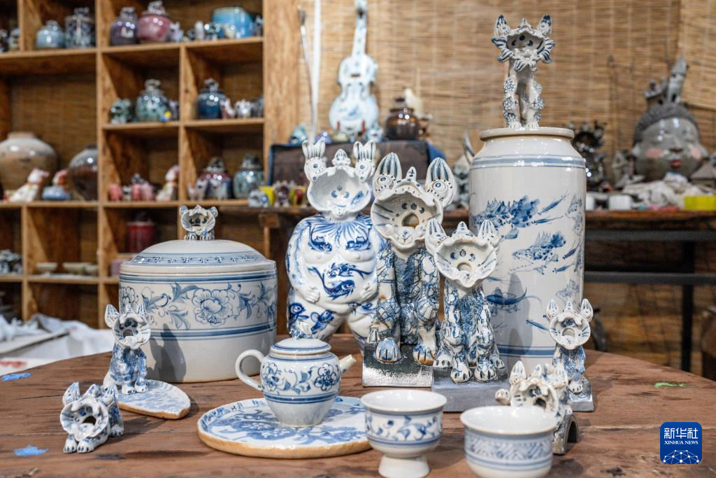 王子強制作的青花釉瓦貓(9月18日攝)。