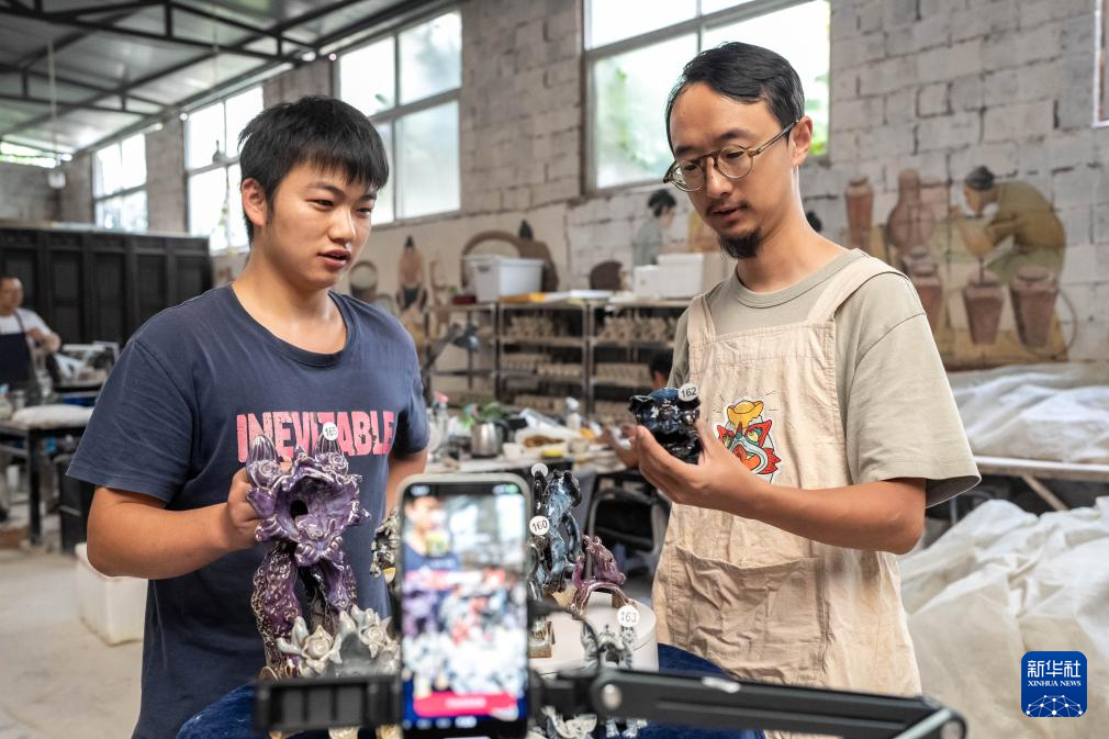 王子強(右)通過網絡直播推介瓦貓(9月18日攝)。