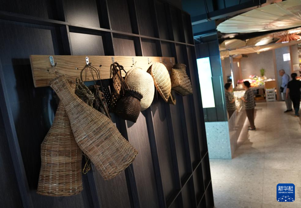改造升級后松木場農貿市場裝飾墻上的魚簍等物件(9月23日攝)。