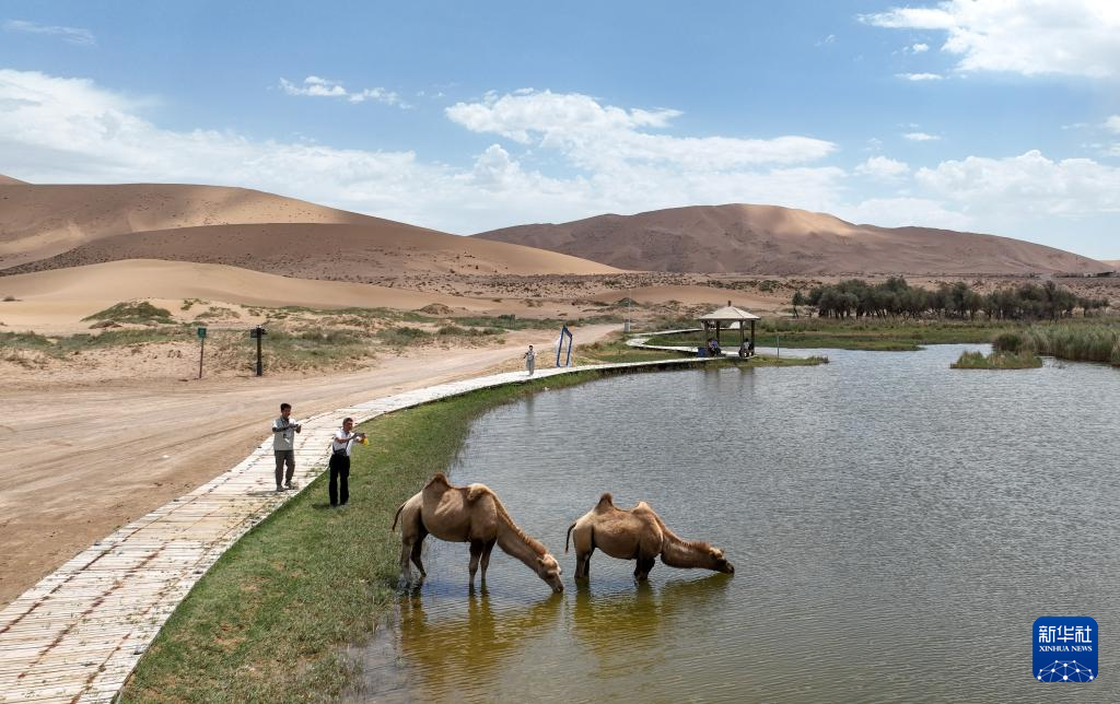 2024年7月31日,游客在巴丹吉林沙漠巴丹湖旁拍攝駱駝(無人機照片)。新華社記者 貝赫 攝