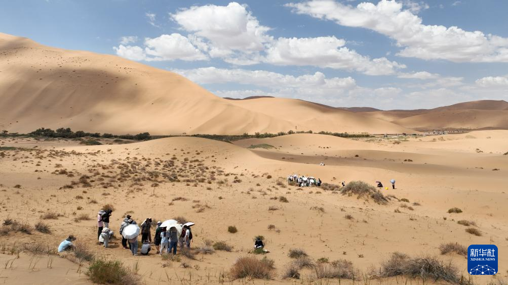 2024年7月31日,來自蘭州大學、香港浸會大學、西南大學等18所高校的100余位師生在巴丹吉林沙漠開展“發現計劃”地理學聯合實習,這是部分師生在巴丹吉林沙漠中開展植被樣方調查(無人機照片)。新華社記者 貝赫 攝