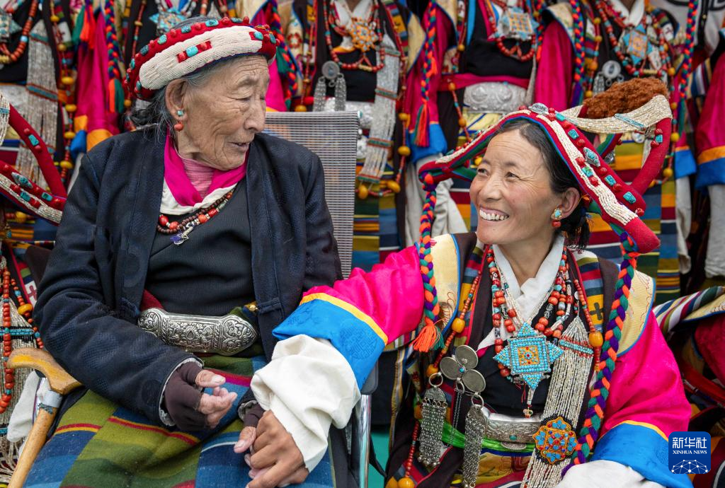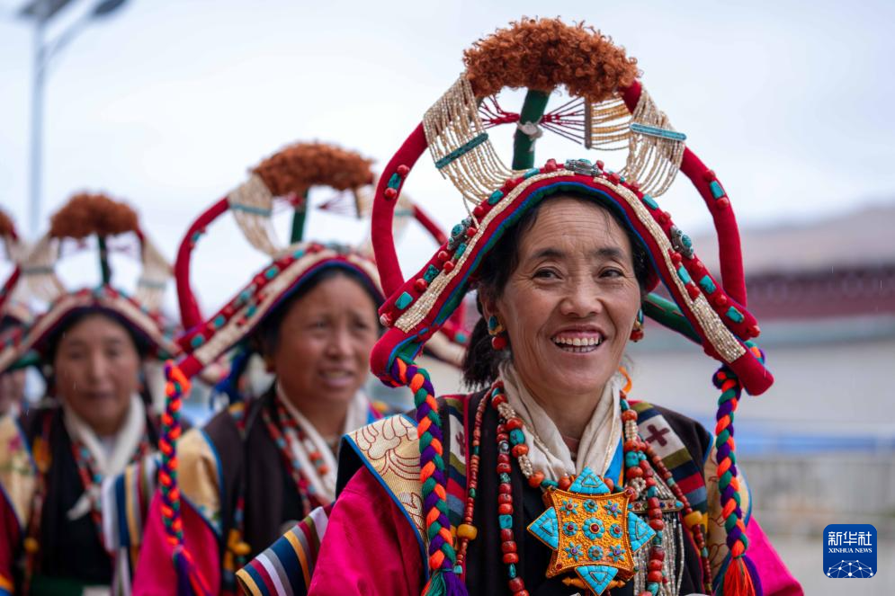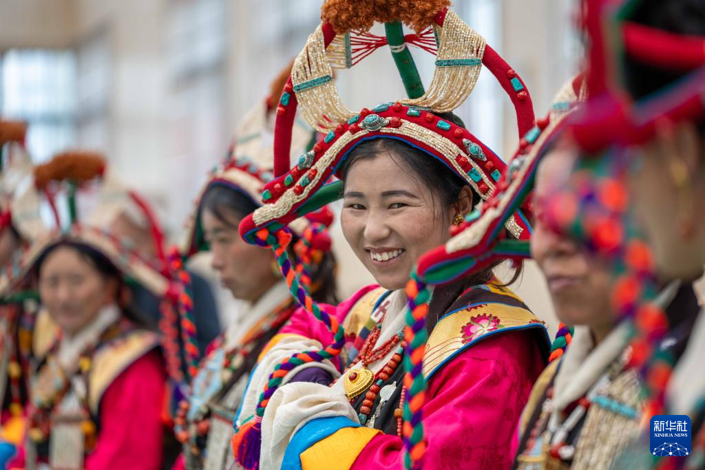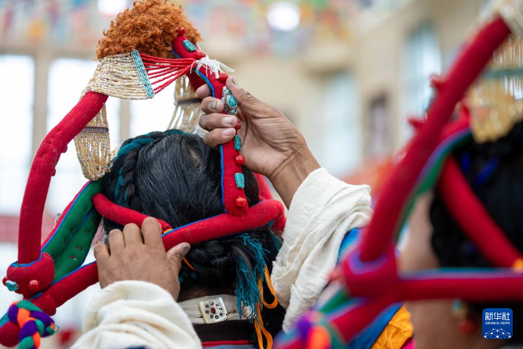 西藏日喀則市定結縣,“薩爾諧欽”演職人員在整理頭飾(9月25日攝)。
