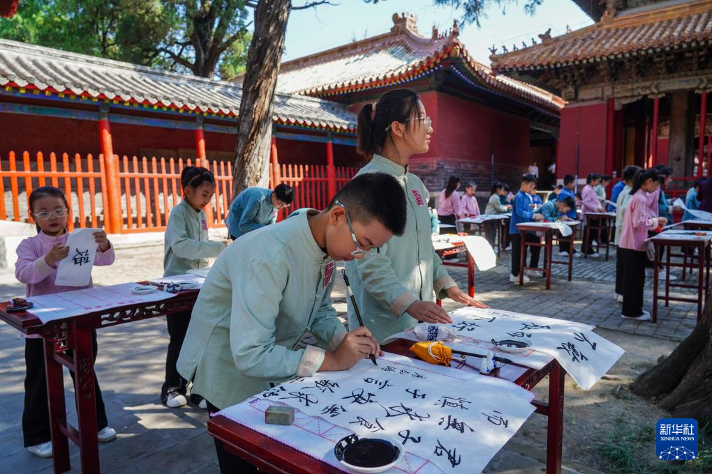 9月28日,在2024甲辰年公祭孔子大典上,學生在曲阜孔廟進行書法創作。