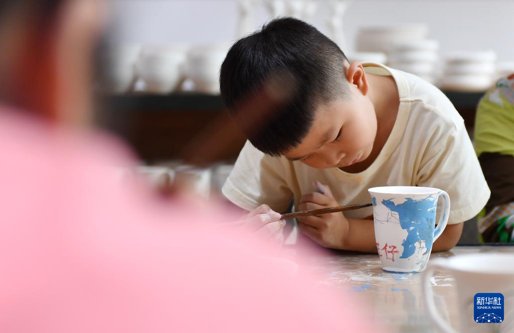 9月27日,在醴陵市一家陶瓷企業的游客體驗區,一名小朋友在陶瓷坯體上涂鴉。