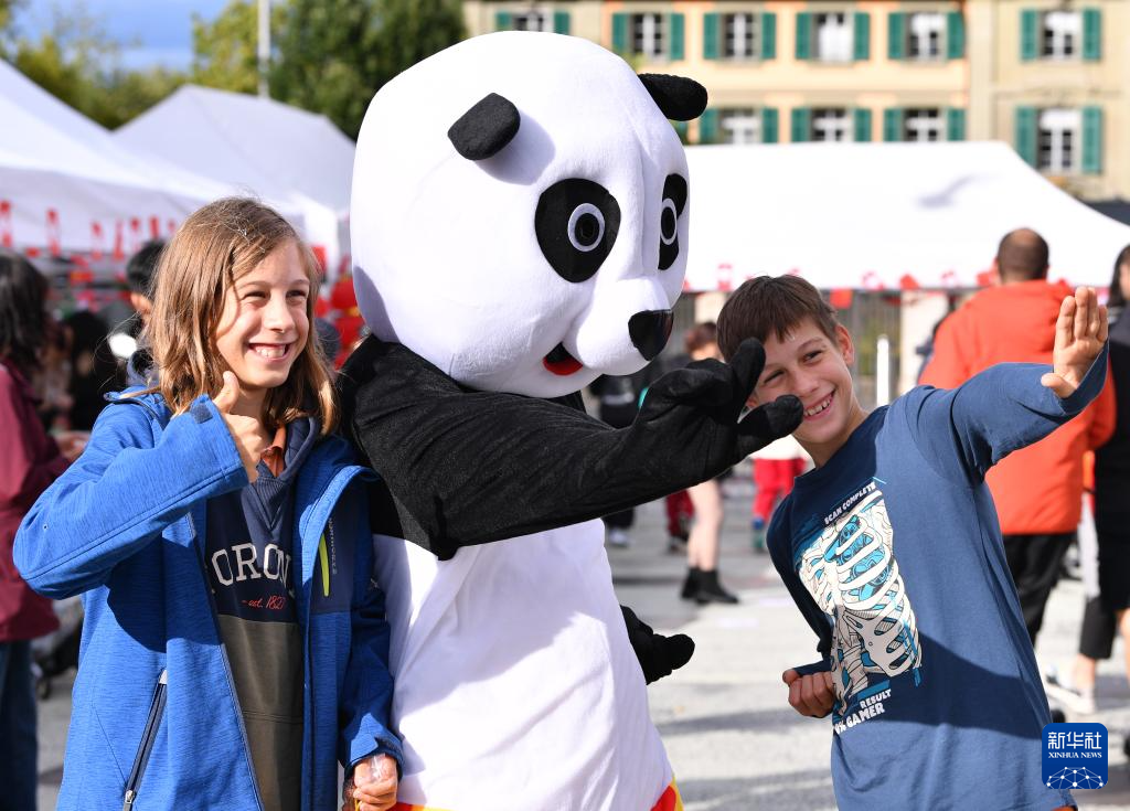 9月27日,在瑞士伯爾尼“遇見中國”文化節上,孩子們與扮成大熊貓的工作人員合影。