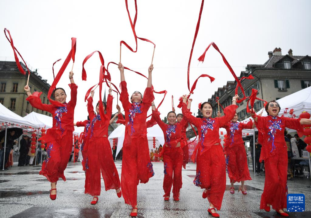 9月27日,在瑞士伯爾尼“遇見中國”文化節上,人們在表演紅綢舞。