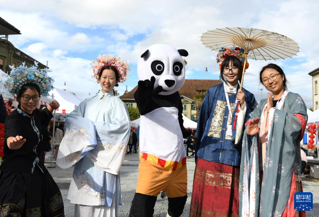 9月27日,在瑞士伯爾尼“遇見中國”文化節上,身穿民俗服飾的活動參與者合影。