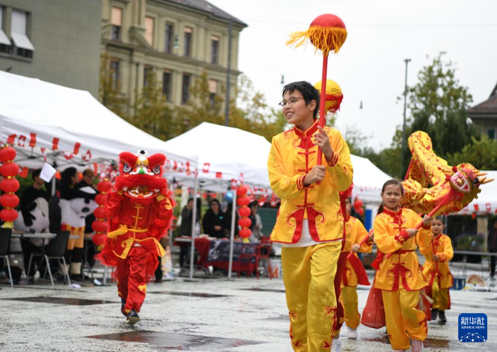 9月27日,在瑞士伯爾尼“遇見中國”文化節上,人們在雨中表演舞龍舞獅。