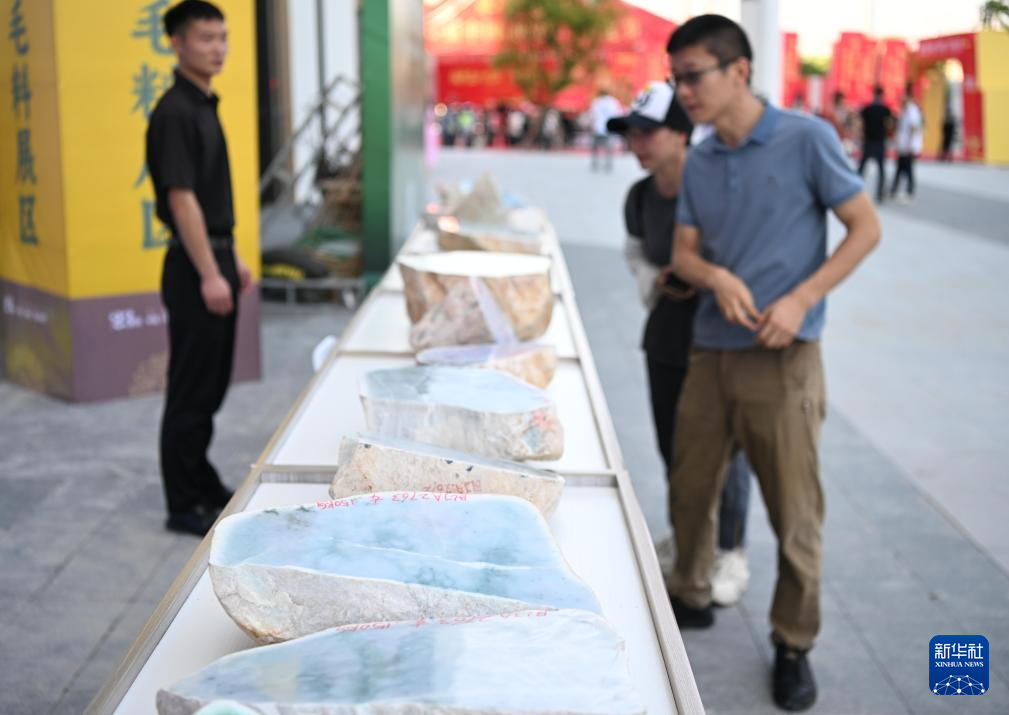 9月29日,觀眾在開幕式上觀看展示的玉石毛料。