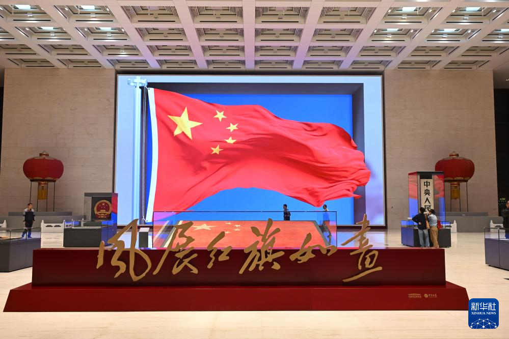 當日,中國國家博物館依托館藏原創策劃的“風展紅旗如畫——館藏紅色經典文物展”在北京開幕。展覽系統展示中國國家博物館館藏革命年代的紅旗、新中國成立后的五星紅旗和黨旗、革命題材經典美術作品等紅色文物60余件,以及100張新時代以國旗為主題的高清照片,并首次輔以裸眼3D動態展示國旗,展現五星紅旗的誕生過程和新時代國旗飄揚在祖國大好河山的壯美場景。