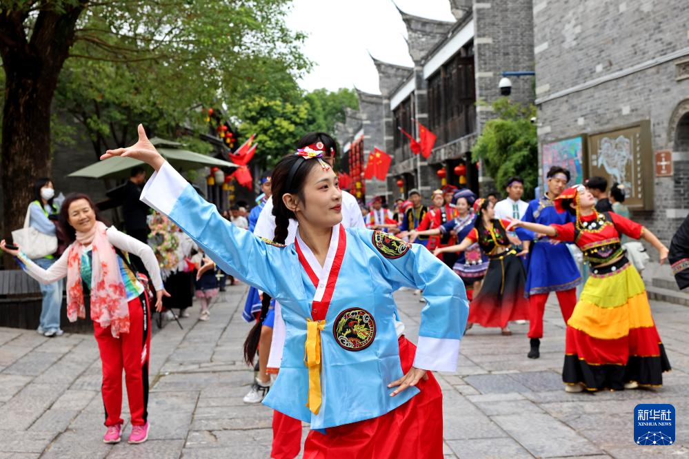 在京杭大運河畔的山東省棗莊市臺兒莊古城,演職人員為游客巡游表演歌舞(10月7日攝)。